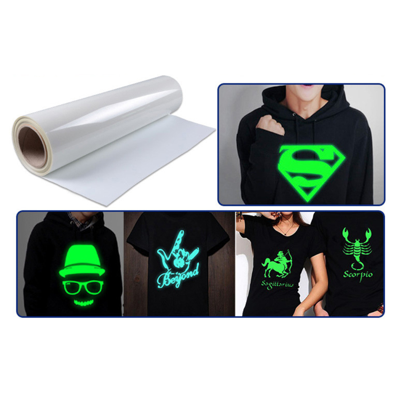 · Glow in dark heat transfer vinyl is environmentally friendly,good fastness after washing ,can be cut,glow in dark,light color fabric or dark color fabric are able to heat transfer.suitable for all kinds of plotter machine.apply to the sample or massive produce of personalized garments, AD shirts,sportswear,caps,cushion,worker uniform,flags ,policeman uniform,safety clothing etc..and suitable for people who work at night time,such as constable in park, night-Zoo worker, constable in border and so on.